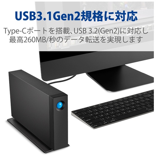 ●質量[kg]:約1.4●記憶容量:4TB●インターフェース:USB3.2(Gen2)●対応機種:標準でUSB3.2(Gen2Gen1)、 USB3.1(Gen2Gen1)、 USB3.0またはUSB2.0インターフェイスを搭載したMacまたはパソコン(600MB以上のディスク空き容量があること)●保証期間:5年間●付属品:USB3.2(Gen2)(USB Type-C(TM) - USB Type-C(TM))ケーブル(約0.9m コネクター含まず) ×1、ACアダプター、QIG●外寸:幅60×奥行130×高188.5mm(スタンド含む)●LaCie型番:STHA4000800●ドライブ数:1●回転数:7200rpm●入力電圧:100V、50/60Hz (ACアダプター) ●コネクター形状:USB3.2 USB Type-C(TM)(USB-C(TM)) ×1 ●RAID機能:無し ●セキュリティスロット:○ ●出荷時フォーマット:exFAT ●冷却ファン:無し ●パソコン電源連動:○ ●アクセスLED:○ ●使用可能地域:日本国内 ※本製品の日本国外での使用、海外からのテクニカルサポート、製品保証については、いっさいお受けいたしかねますので、あらかじめご了承ください。 ●RoHS指令:EU RoHS指令準拠(10物質) ●添付ユーティリティ:LaCie Toolkit ●エネルギー消費効率:II区分:0.00075 ※エネルギー消費効率とは、省エネルギー法で定める測定方法により測定した消費電力を省エネルギー法で定める記憶容量で除したものです。●電気用品安全法適合商品:PSEマーク ●最小出荷単位: 1