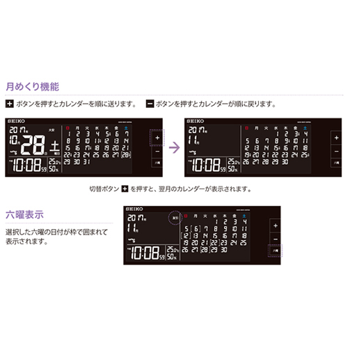 ●メーカー…セイコー(SEIKO)●型番…DL 212B●サイズ(mm)…230(W)×48(D)×114(H)mm●重量…420g●周波数…40/60kHz自動選局●電源…ACアダプタ(コード長約1.8m)バックアップ電池(CR2032)×1個(付属)※※停電時などに時刻・カレンダー情報の記憶の為に駆動し、電池だけでは表示しません。●フレーム材質…プラスチック●風防材質…プラスチック●注意…付属電池はテスト電池ですので新しい電池をご購入下さい。●機能…電子音アラーム、アラームオートストップ機能(約5分間)、スヌーズ、アラームモニター、表示LED明るさ切替式(2段階)、フルオートカレンダー、月めくり機能、六曜表示、温湿度表示、12時間制/24時間制切替式、●電波受信機能●受信OFF機能付き●マンスリーカレンダー搭載の交流式デジタル置時計●記念品などの贈り物におすすめ!●LED表示●参考在庫数・商品詳細・サイズ情報はメーカー(参考)URLからもご確認いただけます。 ●最小出荷単位: 1