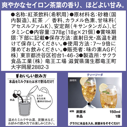 ●種別:紅茶●内容量(個装):18g●入数:21個●タイプ:ポーションタイプ(希釈)●ミルク:無●シュガー:有●甘さ:有●軽減税率:対象●製造国:日本●メーカーの都合によりパッケージや仕様などが変更になる場合がございますので、あらかじめご了承ください。 ●最小出荷単位: 1
