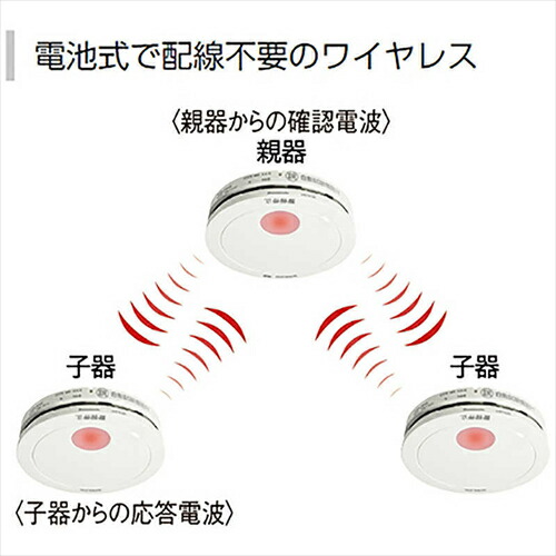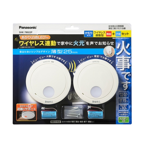 ●メーカー…パナソニック(Panasonic)●型番…SHK79022P●仕様…親機+子機セット●音量…ピーク値:1mにて約90dB(音声)●感知方式…煙式(光電式2種)●電源…専用リチウム電池(付属)●電池寿命…約10年●取付場所…天井面、壁面●サイズ…φ100×25mm●重量…親器:約115g(電池含む)子器:約115g(電池含む)●付属品…取付用木ねじ●形状…露出型 薄型●連動警報開始時間…発報元の警報開始から10秒程度(周囲環境によっては20秒程度かかることもあります)●交換時期お知らせ…作動灯が4回点滅、点滅時に作動灯(警報停止ボタン)を押すと音声でお知らせ●電池切れ警報期間…約1週間●警報停止機能…警報停止ボタンを押すと警報が停止します。●連動可能台数…1システムに親器は1台、子器は14台まで●自動復旧機能…煙・熱がなくなると自動的に警報が停止します。●使用温度範囲…0℃~+40℃●推奨設置場所…寝室・居室・階段・廊下など●発信出力…10mW●電波の到達距離(親器~子器間)…障害物のない場所での水平見通し距離約100m(周囲環境により短くなります。)●検定番号…親器:住警第2020~3号子器:住警第2020~4号●屋内専用●AiSEG2連携●火元を声でお知らせ●あかり(白色LED)付●日本消防検定協会鑑定品●火災をワイヤレス連動で家中に素早くお知らせします。●参考在庫数・商品詳細・サイズ情報はメーカー(参考)URLからもご確認いただけます。 ●最小出荷単位: 1