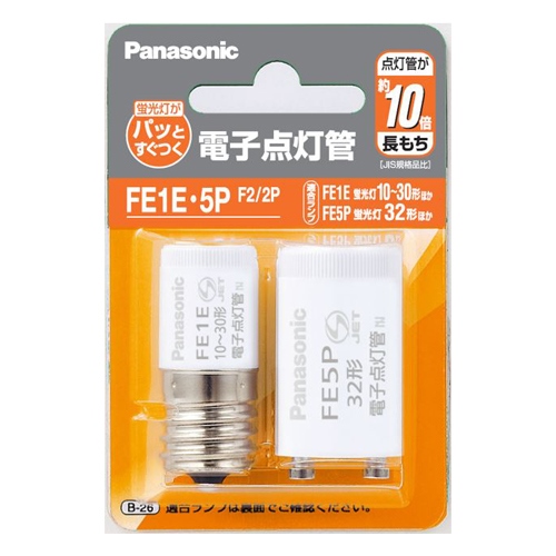 ●メーカー…パナソニック(Panasonic)●型番…FE1E5PF22P●口金…E型・P型●適合蛍光灯…E型:10~30形P型:32形●点灯時間…E型:約1.2秒P型:約0.6秒●定格入力電力…E型:100VP型:147V●作動回数…60000回●入数…2●電子点灯管は蛍光灯の電極を予熱する回路と、安定器から常に一定電圧の高圧パルスをタイミングよく発生する回路を内蔵、一回の作動で蛍光灯がすぐに点灯します。●電子回路で構成されているため、長寿命です。●寿命は従来の点灯管と比べ、電子回路で部品が構成されているため、約10倍の長寿命を実現。●合放電管および、器具ソケットに適合した品種をご使用ください。●参考在庫数・商品詳細・サイズ情報はメーカー(参考)URLからもご確認いただけます。 ●最小出荷単位: 1
