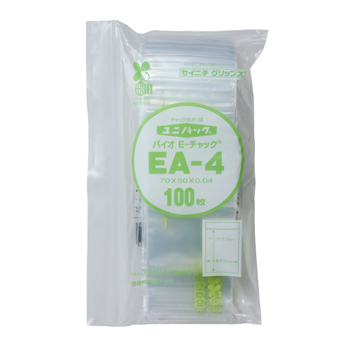 ●メーカー…生産日本社(セイニチ)●型番…EA-4●商品名…ユニパックバイオ E-チャック●チャック下サイズ(mm)…70×50●厚み(mm)…0.04●入数…100枚●材質…低密度ポリエチレン●重量(g)…0.53/枚●フィルム厚0.04mmのチャック付ポリエチレン袋です。●開けやすく閉めやすいE-チャックを採用。●衣類・日用雑貨・食品など幅広い用途に使用できます。●サトウキビ(非可食成分)の廃蜜糖からできた「グリーンポリエチレン」を使用しており、従来品と比較してCO2を約20%削減。(メーカー比)●バイオマスマーク認定商品●日本製●参考在庫数・商品詳細・サイズ情報はメーカー(参考)URLからもご確認いただけます。 ●最小出荷単位: 1