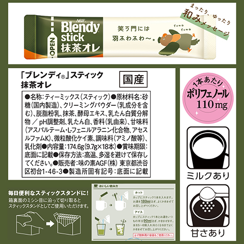 ●種別:抹茶オレ●入数:18本●内容量(個装):9.7g●ミルク:有●甘さ:有●メーカーの都合によりパッケージや仕様などが変更になる場合がございますので、あらかじめご了承ください。 ●最小出荷単位: 1