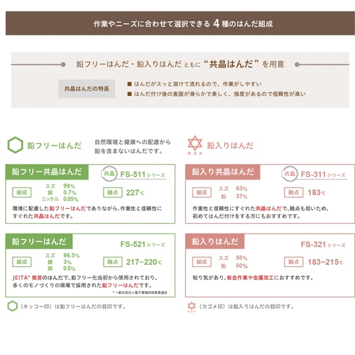 ●メーカー…白光●型番…FS511-03101●線径(mm)…φ0.3●巻(g)…6.35●長さ…1m●組成…スズ(99%)、銅(0.7%)、ニッケル(0.05%)(ゲルマニウム0.01%以下添加)●融点…227℃●フラックス…入り(ROM1)●入数…1個●用途…チップ部品や精密作業などに●無洗浄タイプ●環境に配慮した鉛フリーはんだでありながら、作業性と信頼性にすぐれた共晶はんだです。●はんだがスッと溶けて流れるので、作業がしやすいです。●はんだ付けしやすく、腐食性が低いフラックスを採用したことで、はんだ付け後の洗浄が必要ありません。●保管に便利なチャック付き袋入りです。●少量ずつ購入できるので、作業に合わせたはんだをお選びいただけます。●参考在庫数・商品詳細・サイズ情報はメーカー(参考)URLからもご確認いただけます。 ●最小出荷単位: 1