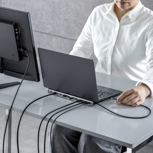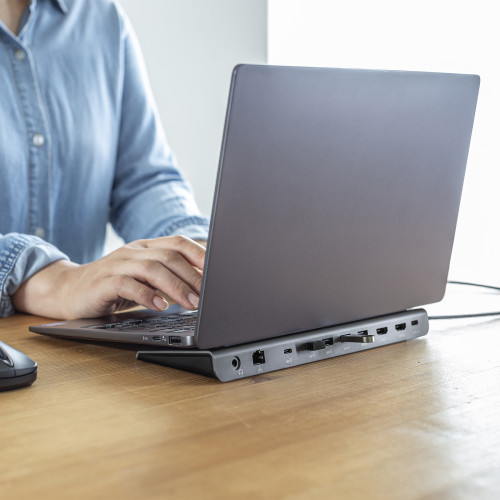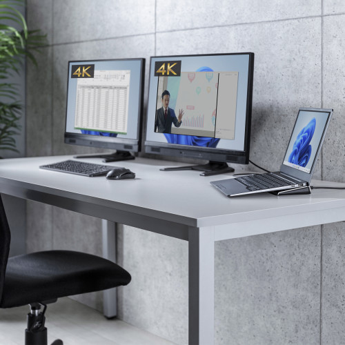 ノートパソコンの下に設置可能な省スペースタイプ。HDMI 2ポート搭載で、最大2台のディスプレイへの4K映像出力に対応、5ポートUSBハブ仕様