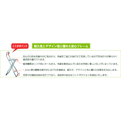 ●サイズ(mm)…φ320×885(H) ●カラー…ラインブラック/ブラック ●折りたたみ時…350(W)×105(D)×960(H)mm ●重量…3.2kg ●材質…座面:塩化ビニル、フレーム:スチールパイプ ●耐荷重…80kg ●脚幅…350mm ●日本製 ●国内生産にこだわり、職人の手で生み出されるオリタタミイス ●スライド式で折り畳みがワンタッチ。 ●折り畳めて収納に便利です。 ●しっかりしたビニールシートでタフに使えます。 ●安全性の高いスライド方式によるワンアクションフォールディング ●耐久性とデザイン性に優れた安心フレーム ●背もたれ銅板を緩やかに湾曲させ、外縁を二重に折り曲げ加工を施しているので背当たりが柔らかく強度面も優れています。 ●座部銅板はリング状にカールさせ、外縁を巻き込んでいるため手指に優しい仕上げになっています。 ●1.2mm厚の銅管を緩やかに曲げた前後脚は、耐久性・デザインともに優れた効果を生み出します。 ●足掛けは強度を高めるだけでなく、着座時の自由なフットポジションを演出いたします。 ●参考在庫数・商品詳細・サイズ情報はメーカー(参考)URLからもご確認いただけます。 ●最小出荷単位: 1