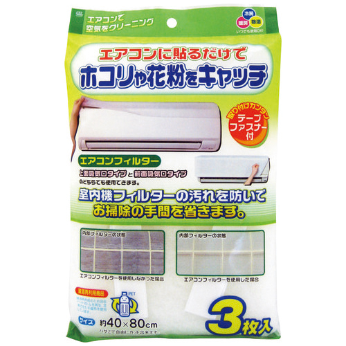 ●入数:3枚●外形寸法(横)[cm]:40●外形寸法(縦)[cm]:80●質量[g]:10●色:ホワイト●仕様:テープファスナー固定式●種別:家庭サイズエアコン用●付属品:テープファスナー24枚●材質:不織布(ポリエステル70% アクリル30%)●製造国:日本●交換時期目安:約3~6ヵ月●お好きなサイズにカットしてご使用いただけます。●テープファスナー付(8×3枚分入り) ●最小出荷単位: 1