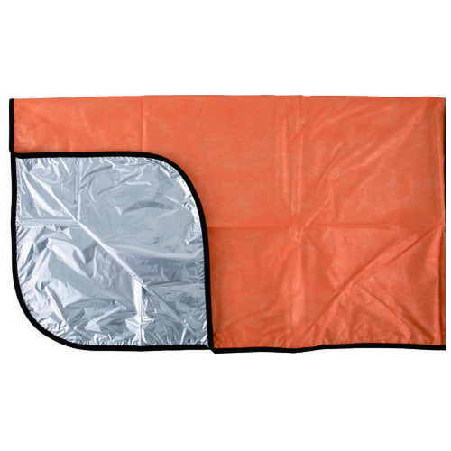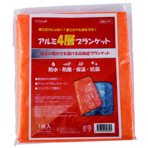 防水・防風・保温効果のあるアルミ4層の抗菌ブランケット。片面は不織布でカサカサ音が少なく、使用後も綺麗に折りたたんで保管できます。