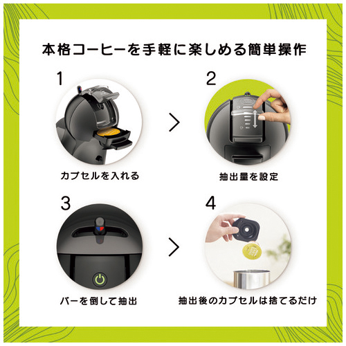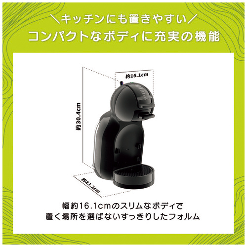 ●色(本体):ピアノブラック&グレー●外形寸法:幅161×奥232×高304mm●質量:約2.3kg●タンク容量:800mL●電源:100V(50/60Hz)●消費電力:1460W●保証期間:1年間●オートストップ機能:有●付属品:取扱説明書●ドルチェグストサポートセンター:0120-879-816(受付時間:9:00~18:00) ●最小出荷単位: 1