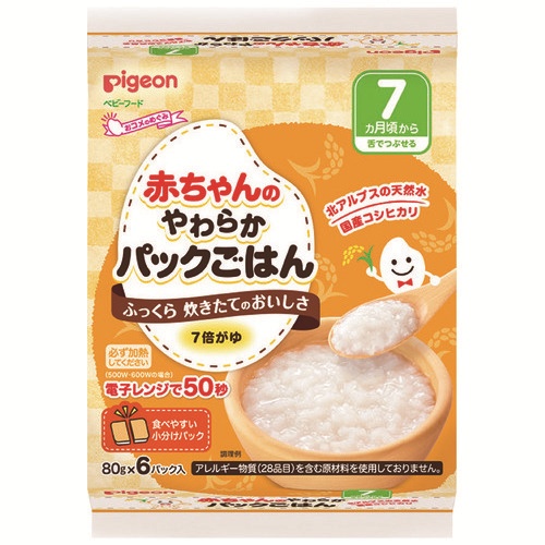 赤ちゃんの月齢に合わせて、やわらかさを選べるラインナップ。舌でつぶせる7ヵ月頃に合わせた7倍がゆです。食べやすい小分けパックで6パック入り。