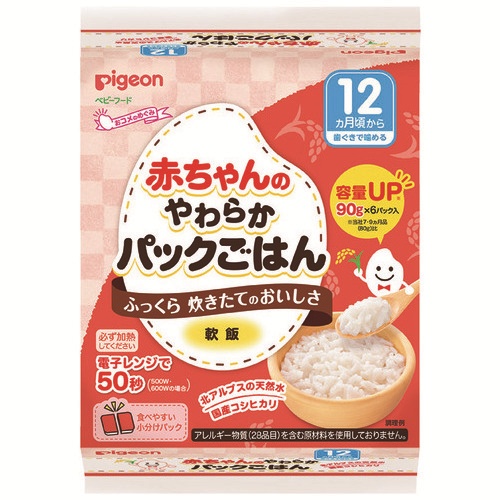 赤ちゃんの月齢に合わせて、やわらかさを選べるラインナップ。歯ぐきで噛める12ヵ月頃に合わせた軟飯です。食べやすい小分けパックで6パック入り。