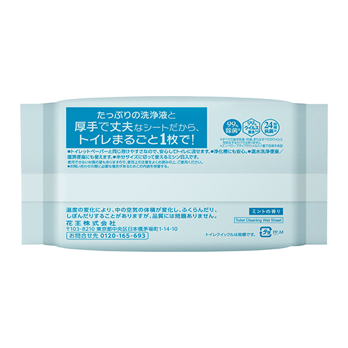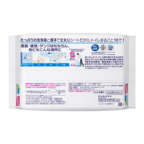 【花王買っトクまつり!まとめ買いが今だけオトク!/2025年12月31日まで(※販売状況によって、キャンペーン期間中に販売が終了になる可能性がございます)】トイレ中の汚れをすっきり落とせるお掃除シート。たっぷりの洗浄液で、便器から床まで汚れをスッキリ落とせるトイレ用お掃除シートです。厚手で丈夫なので、汚れが手につかず、安心してお掃除できます。除菌・抗菌(すべての菌を除菌・抗菌するわけではありません。)に加え、ウイルス除去(すべてのウイルスを除去するわけではありません。エンベロープタイプのウイルス1種で効果を検証。)も。使用後はそのままトイレに流せます。すっきりとしたミントの香り。また、別売りの「クイックルミニワイパー」を使用すれば、狭くて届きにくいトイレの床奥やおそうじしにくい便器のキワまで、ひざをつかずにラクラクきれい。