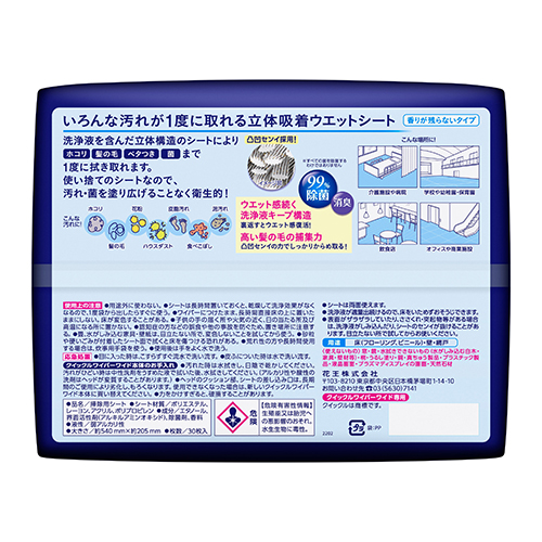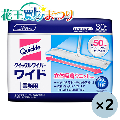 【花王買っトクまつり!まとめ買いが今だけオトク!/2025年12月31日まで(※販売状況によって、キャンペーン期間中に販売が終了になる可能性がございます)】クイックルワイパーワイド業務用専用の立体吸着ウエットシート。ベタベタ汚れのリセット清掃に!洗浄液を含んだ立体構造のシートで、ホコリ・髪の毛から皮脂・泥・食べこぼしまで1度に拭き取れます。使い捨てのシートなので、汚れや菌を塗り広げることなく衛生的。シートは両面使えるワイドサイズで、広いスペースもラクラク清掃できます。99%除菌(*)&消臭。香りが残らないタイプ。*すべての菌を除菌するわけではありません。