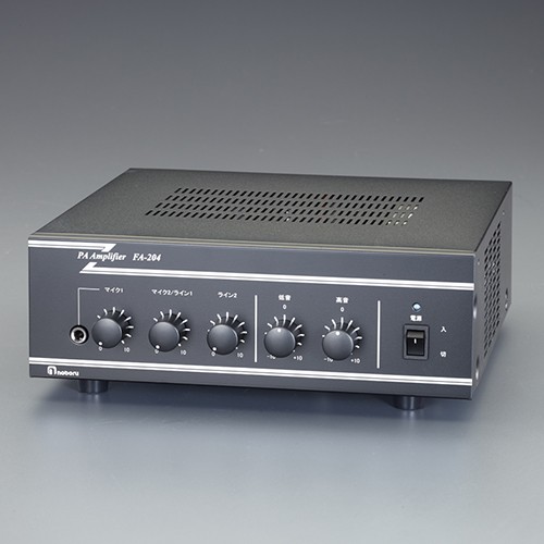 ●メーカー…ノボル電機 ●型番…FA-204 ●サイズ(W×D×H)mm…272×103×304 ●重量(g)…5300 ●材質…前面パネル:鋼板、半艶黒 後面パネル:鋼板、半艶黒 カバー:鋼板、半艶黒 ●定格出力…40W ●電源…AC100V/DC24V ●周波数特性…100Hz~15kHz 偏差±3dB(定格出力-10dB時) ●負荷インピーダンス…4~16Ω 250Ω 500Ω ●入力感度及びインピーダンス…マイク1:-62dBV 600Ω(電子平衡) φ6.3標準ジャック マイク2/ ライン1:-62dBV 600Ω(電子平衡)/-22dBV 10kΩ(電子平衡) スライドスイッチ切替式φ6.3標準ジャック/キャノンタイプコネクタ ライン2:-22dBV 10kΩ 不平衡 RCAピンジャック ページング:-22dBV~0dBV 10kΩ 不平衡 半固定VR付 100系入力:約100V 20kΩ 平衡 半固定VR付 ●ライン出力…0dBV 600Ω 不平衡 RCAピンジャック ●付帯機能…ミュート:ページング入力優先でマイク1・マイク2/ライン1・ライン2が被優先、マイク2/ライン1優先でマイク1・ライン2が被優先、減衰量はマイク1、マイク2/ライン1、ライン2はいずれも40dB以上。 リモートコントロール:無電圧メーク接点にて起動。接点容量 DC24V 10mA。 ページング起動:無電圧メーク接点にて起動し内蔵の予告音動作。予告音(ピン・ポン)の音量は半固定VRで調節可能 ●使用温度範囲…10度~+50度 ※ただし結露のおそれがある場所では使用不可 ●付属品…φ6.3ステレオプラグ ●2電源方式を採用しており、AC100VでもDC24Vでも使用が可能です。 ●音質調整ができ、高音部と低音部それぞれの音質調整でより聞き取りやすくする事が可能です。 ●ミュート機能付で、優先入力に信号が入ると、被優先入力の音量は自動的に減衰します。 ●マイク1の入力は前面パネルに、その他の入力はリアパネルに備えています。 ●マイク2は、ライン1とスライドスイッチで切替が簡単です。 ●ページング起動端子を使えばページング放送時に「ピン・ポン」と喚起放送可能です。 ●既設のスピーカーラインから入力できる100系入力で増設も可能です。 ●リモートコントロール端子付で必要な時だけ電源制御が可能です。 ●参考在庫数・商品詳細・サイズ情報はメーカー(参考)URLからもご確認いただけます。 ●最小出荷単位: 1