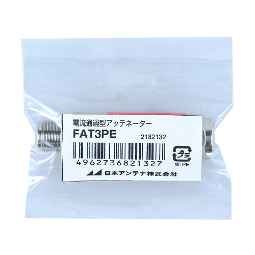 ●メーカー…日本アンテナ ●型番…FAT3PE ●減衰量…10~2150MHz:3.0dB±0.6 2150~2681MHz:3.0dB±0.8 2681~3224MHz:3.0dB±1.0 ●電圧定在波比(以下)…10~1489MHz:1.5 1489~3224MHz:1.8 ●漏洩電界強度(3m法による)…10~1000MHz:34dBμV/m以下 1000~3224MHz:40.2dBμV/m以下 ●インピーダンス…75Ω ●使用温度範囲…-20~40度 ●サイズ…12×48.6mm ●重量…21g ●材質…黄銅 ●対応周波数…V-Low、FM、UHF、CATV、CS・BS 3224MHz ●3.2GHz対応、3dB用のアッテネーターです。 ●10~3224MHzをフラットに減衰させます。 ●F型用・入力端子と出力端子間 電流通過 ●4K・8K共同受信用 ●最大DC15V・0.8A/AC30V・1A ●ハイシールドマーク登録商品 ●参考在庫数・商品詳細・サイズ情報はメーカー(参考)URLからもご確認いただけます。 ●最小出荷単位: 1