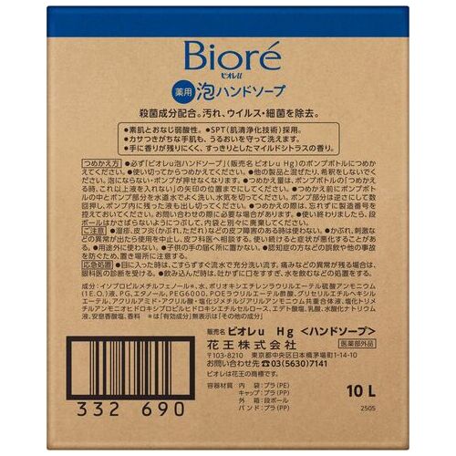 ●寸法:263×210×259 [ミリメートル]●内容量:10L●液性:弱酸性●成分:イソプロピルメチルフェノール*、水、ポリオキシエチレンラウリルエーテル硫酸アンモニウム(2E.O.)液 他●有効成分:イソプロピルメチルフェノール●香り:マイルドシトラスの香り●仕様:専用コック別売:896-642●種別:つめかえ(業務用)●製造国:日本/業務品●品目:泡ハンドソープ●医薬部外品:該当 ●最小出荷単位: 1