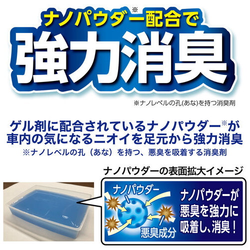 ●内容量:300g●香り:無香料●成分:無機系消臭剤、界面活性剤(非イオン)、ゲル化剤●使用期間の目安:約1~2ヵ月(季節や使用状況により異なります。)●用途:自動車シート下専用●付属品:両面テープ●製造国:日本●ゼリーが小さくなったらお取り替えください。 ●最小出荷単位: 1