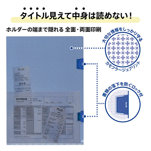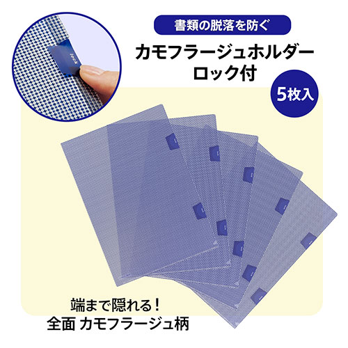 大事な書類の情報を守る透明クリアーホルダー「カモフラージュホルダー」シリーズに、全面カモフラージュ柄印刷と簡易ロック機能によりセキュリティを強化した「カモフラージュホルダー ロック付」が登場。全面印刷と上下ロックで給与明細やレシートなどの小さな書類の隙間からのちら見え、落下を防ぎます。