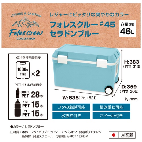 ●外形寸法(幅)[mm]:635●外形寸法(奥)[mm]:359●外形寸法(高)[mm]:383●質量[kg]:4.5●容量[L]:46●収納目安:ペットボトル2L×15本●色:セラドンブルー●材質:本体・フタ=ポリプロピレン、フタパッキン=発砲ポリエチレン、断熱材=発砲スチロール、水抜栓パッキン=EPDM●製造国:日本●内寸(幅x奥x高):521×266×313mm ●最小出荷単位: 1