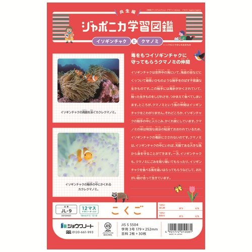 ●外形寸法(縦)[mm]:252●外形寸法(横)[mm]:179●ページ数[枚]:60●枚数[枚]:30●方眼:無●方眼点線:無●マス数[マス]:12×8●マス寸法(縦)[mm]:18●マス寸法(横)[mm]:18●リーダー:有●白色度:70%●製本形式:糸綴じ●坪量:70●色:赤●教科:こくご●対象学年:1~3年●ベルマーク:ベルマーク参加商品●枚数(1冊あたり)[枚]:30●規格:セミB5●種別:こくご12マス(リーダー入)●材質:紙製●製造国:日本●学習百科付き2枚6ページ●ベルマーク参加商品●日本PTA全国協議会推薦 ●最小出荷単位: 1