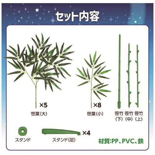 ●外形寸法(高)[mm]:2000mm●質量:924g●付属品:笹竹×3、笹葉(大)×5、笹葉(小)×8、スタンド×1●材質:PP、PVC、鉄、ポリエステル●パッケージサイズ:70×230×570mm●セット内容:笹竹×3、笹葉(大)×5、笹葉(小)×8、スタンド×1組●詳細サイズ:全長:約2m ●最小出荷単位: 1