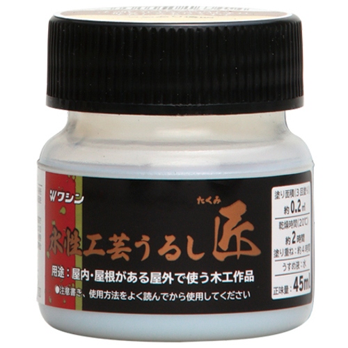 ●内容量:45mL●寸法:50×50×56mm●乾燥時間:約 2 時間(20℃)●塗り面積:約 0.2 ㎡●塗り回数:3回●用途:室内の木工作品●色:つやあり透明●材質:合成樹脂、水●製造国:日本●注意事項:表面が乾燥したらサンドペーパー(400~600番位)をかけ3回ほど塗り重ねると、美しいつやのある仕上がりになります。刷毛等の用具は乾燥する前に水洗いしてください。●水塗り回数:3回 ●最小出荷単位: 1