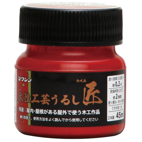 ●内容量:45mL●寸法:50×50×56mm●乾燥時間:約 2 時間(20℃)●塗り面積:約 0.2 ㎡●塗り回数:3回●用途:室内の木工作品●色:鎌倉赤●材質:合成樹脂、水●製造国:日本●注意事項:表面が乾燥したらサンドペーパー(400~600番位)をかけ3回ほど塗り重ねると、美しいつやのある仕上がりになります。刷毛等の用具は乾燥する前に水洗いしてください。●水塗り回数:3回 ●最小出荷単位: 1
