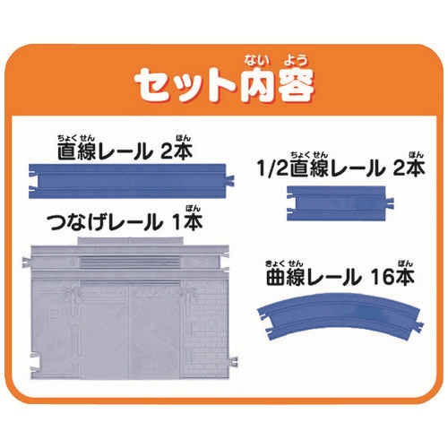 ●対象年齢:3歳~●セット内容:1/2直線レール×2、曲線レール×16、直線レール×2、つなげレール×1●寸法:パッケージ=W240×H180×D80mm ●最小出荷単位: 1