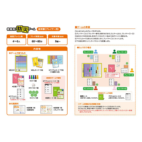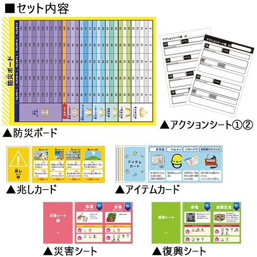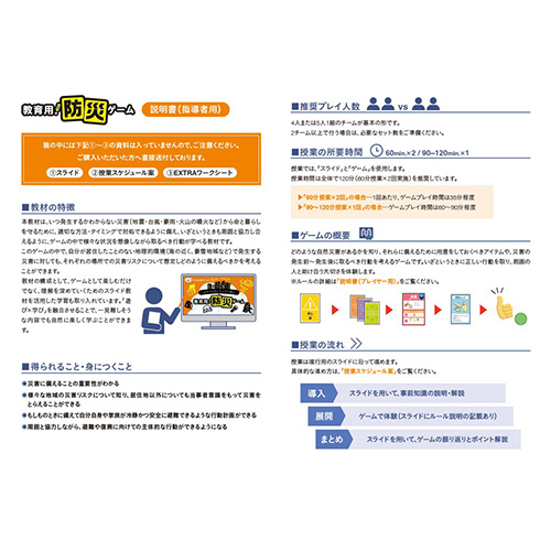 ●質量[g]:550●カード寸法(縦)[mm]:89●カード寸法(横)[mm]:58●カード厚[mm]:0.335●パッケージ寸法:270×195×28mm●対象年齢:(目安)9歳~●セット内容:ボードゲーム一式(防災ボード=1枚、兆しカード=15枚、アイテムカード=75枚、災害シート=15枚、復興シート=5枚、アクションシート2種類=各1枚、コマ=5個、サイコロ=1個、コイン=5枚)、説明書(指導者用・プレイヤー用)、授業進行用スライド・授業スケジュール案(データ提供・CD別添)●参加人数:4~5人●種別:1箱●材質:紙●所要時間:60分×2●【ダイジェスト版商品紹介動画Youtubeメーカーサイト】https://www.youtube.com/watch?v=CzVwQCUnY9A&list=PLfGhRj-Hi0REPZ40WV733_MGPrEBJtH3q&index=5●メーカー:イー・ラーニング研究所●シリーズ名:子ども未来キャリア●製造国:日本 ●最小出荷単位: 1