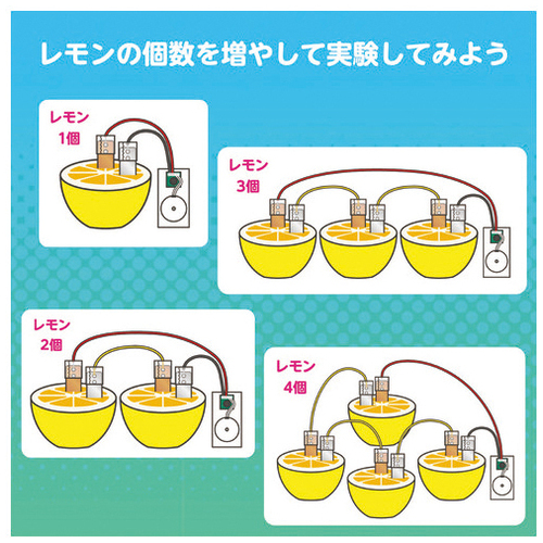 果物から電気が発生!レモンの「酸」と「マグネシウム合金」を利用して電気を発生させる実験キットです。