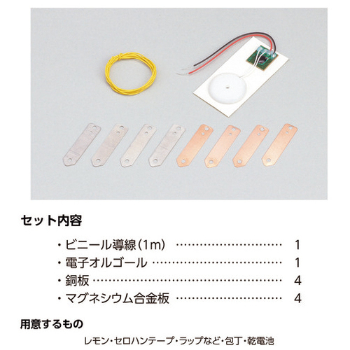 ●対象学年:小学校3年生(単元として学ぶのは中学3年生)●セット内容:電子オルゴール、ビニール導線、銅板、マグネシウム合板×4●サイズ:90×145×40mm●質量:29g●材質:銅、マグネシウム合金●注意事項:レモンは付属していません●製造国:日本 ●最小出荷単位: 1