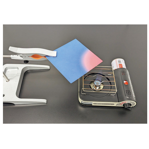 金属の熱の伝わり方の実験で使用する銅板に温度で変色する示温インクが予め塗布されています。