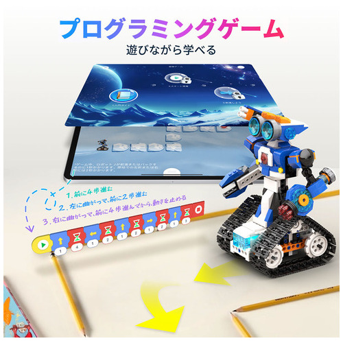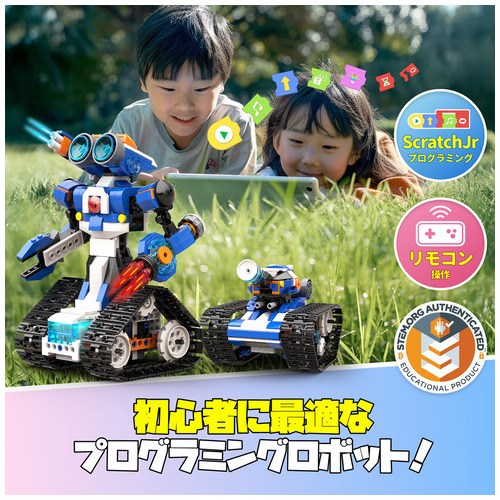 ●セット内容:コントロールモジュール×1個、モーター×2個、LEDライト×2個●対応OS:iOS10以上/Android8以上●対応デバイス:iOS端末/Android端末●接続方法:Bluetooth4.0以上●電源:単三電池3本(別売り)●組立:必要●対象年齢:7歳以上●対応機種:iOS端末/Android端末●質量:810g●仕様:ブロック480個セット●種別:6種のロボットデザインJ●付属品:組立説明書、ユーザーガイド●材質:ブロック=ABS●プログラミングアプリ/Scratch Jr●製造国:中国 ●最小出荷単位: 1