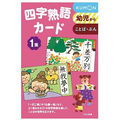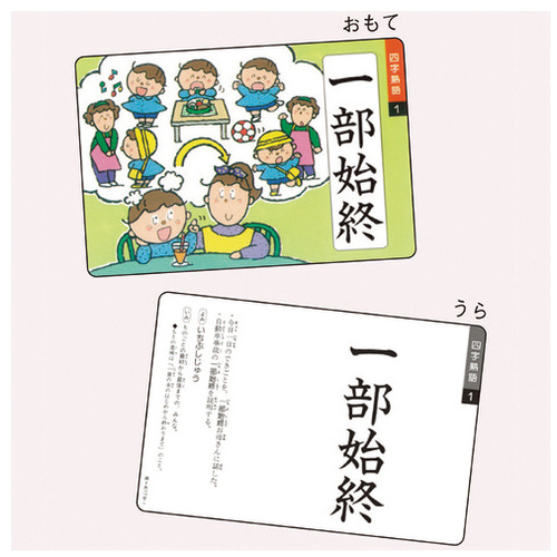 「一喜一憂」「十人十色」など、よく使われる四字熟語を通してことばの世界を広げます。4つの漢字で様子や状態を表現する四字熟語は、ことばへの好奇心を育みます。カード表面には「四字熟語をイメージするイラスト」と「四字熟語」を掲載。裏面には四字熟語と四字熟語の簡単な意味や使い方を掲載しています。