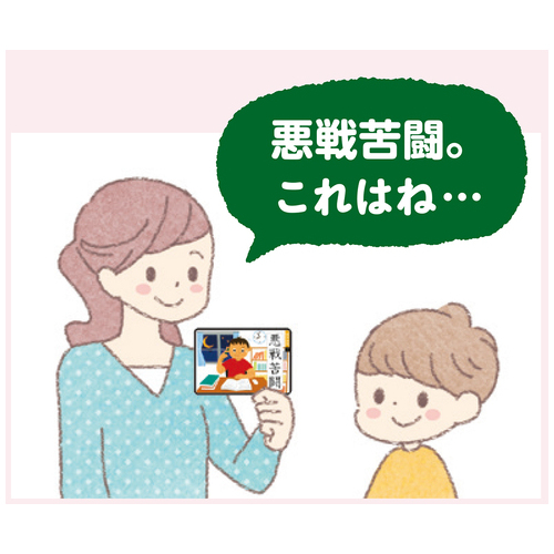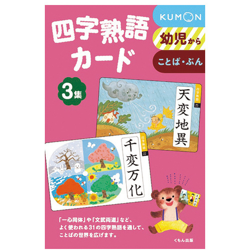 「一喜一憂」「十人十色」など、よく使われる四字熟語を通してことばの世界を広げます。4つの漢字で様子や状態を表現する四字熟語は、ことばへの好奇心を育みます。カード表面には「四字熟語をイメージするイラスト」と「四字熟語」を掲載。裏面には四字熟語と四字熟語の簡単な意味や使い方を掲載しています。