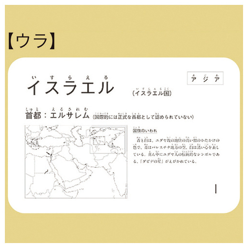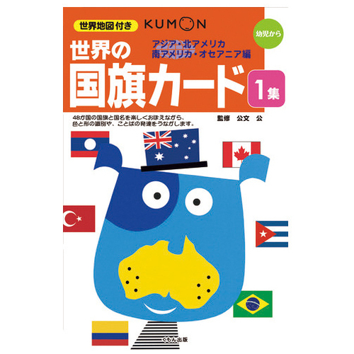 日本になじみがあり、交易や観光などで関係の深い国々、国旗のデザインのユニークな国々から、1~3巻で各48ヶ国を収録。カード表面には「その国の国旗のイラスト」を掲載。裏面には、「国名(正式名称)」とともに、「国の所在地図」「首都名」「首都所在地」「国旗のいわれ」がわかりやすく記されています。収録できなかった国旗一覧の世界地図が付属しています。