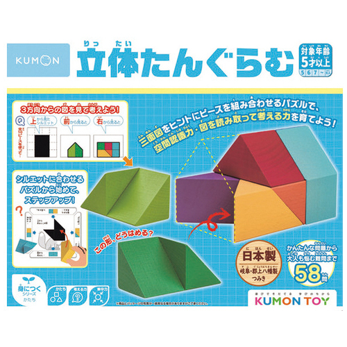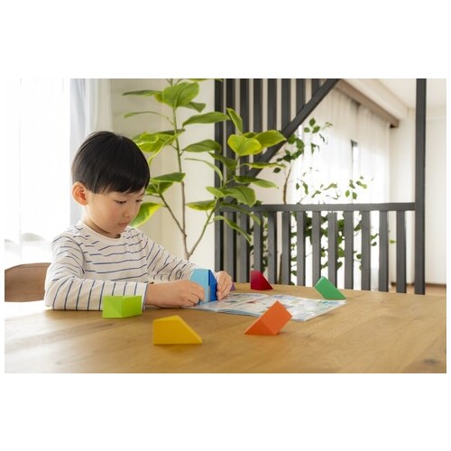 三面図をヒントにピースを組み合わせるパズルで、空間認識力、図から読み取って考える力を育てよう!上から見たシルエットと、前後左右から見た図を手がかりに、ピースを組み合わせて立体を作るパズルです。ねじれて立体的なピースがあることで、上から見たシルエットに形を合わせるだけでなく、前後左右から見た立体的な構成や、ピースの色も考えて組み立てることを通して、「図から読み取り、複数の情報を合わせて考える力」や「空間認識力」を養います。