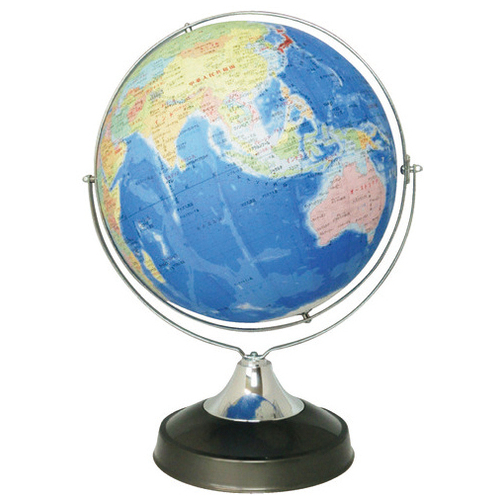 低反射仕上げ、大きな文字で読みやすい「シンプル地球儀」シリーズ。18枚に分割した地図を、手貼り製法で仕上げています。上下回転可能なリング式ホルダー仕様です。2 軸で回転します。