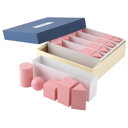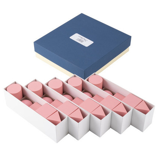 基本的な立体5種類を小型化した児童用グループセットです。立体を1個ずつ入れた中箱が、5セットに分かれて収納されており、グループごとにすぐに分配できます 。