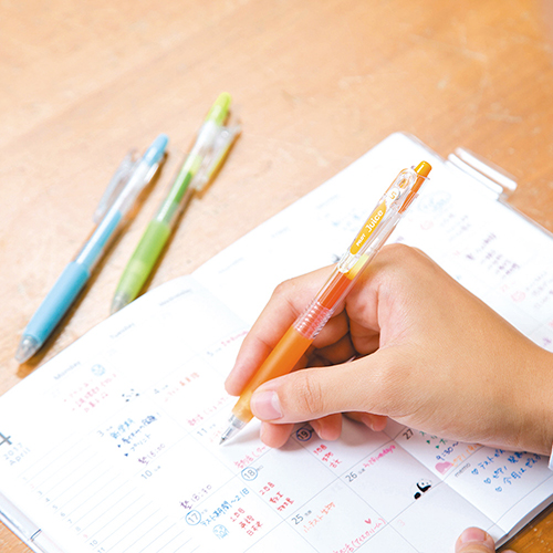 書き出しからくっきりなめらかに書けるゲルインクボールペン。10万回はさんでもこわれない(※メーカー試験による)丈夫なリフトクリップでバインダーなどにも挟めます。