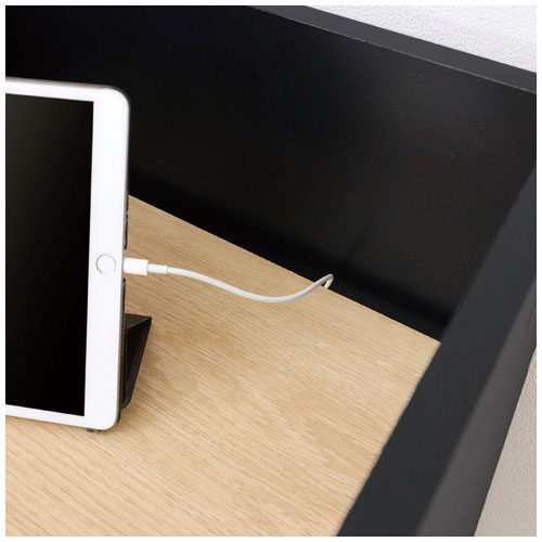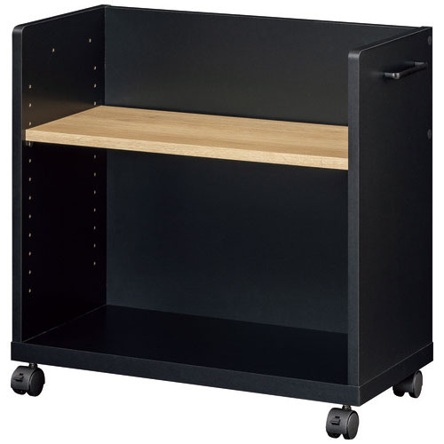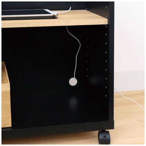 デスク下にすっきりとおさまるシンプルタイプの木製アンダーデスクワゴン/ブラック。上段はOAタップ等をスッキリ収納できるよう開口部から配線を通せる仕様。棚板は可動式です。★「組立有料サービス付」は、商品コード228-357をお選びください。