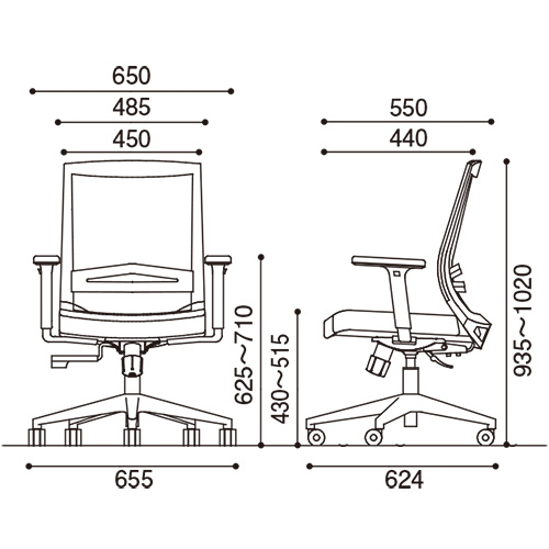 ●外形寸法(幅)[mm]:655●外形寸法(奥)[mm]:624●外形寸法(高)[mm]:935~1020●質量[kg]:14.9●肘:肘付き●肘タイプ:可動式●色:ブラック●座面高[mm]:430~515●座面寸法(幅)[mm]:485●座面寸法(奥)[mm]:440●肘高[mm]:625~710●材質:背(張地/芯材)=メッシュ(ポリエステル)/ポリプロピレン・ナイロン、座(張地/芯材)=布(ポリエステル)/合板、クッション=モールドウレタン、脚=強化樹脂、キャスター=直径55mmナイロン双輪キャスター●肘=強化樹脂●機能:ガス圧座上下、シンクロロッキング、通常位置停止可能、ランバーサポート調節(60mm)、肘高さ調節(8段階・10mmピッチ) ●最小出荷単位: 1