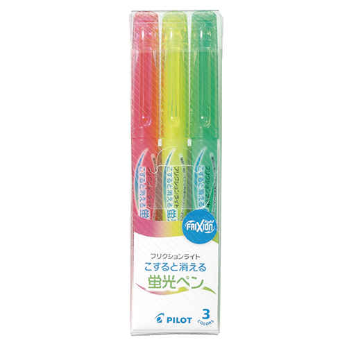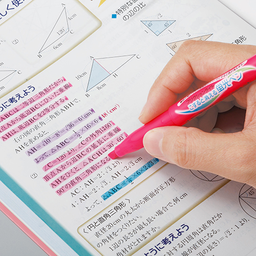 こすると消える蛍光ペンです。筆跡が乾いてから、本体後部のラバーでこすると色が消える!摩擦熱で色を無色化するため消しカスがなく、同じ場所に何度でも書き直すことができます。線を引きすぎても引きすぎた分だけ消せます。資料へのマーキングに適しています。