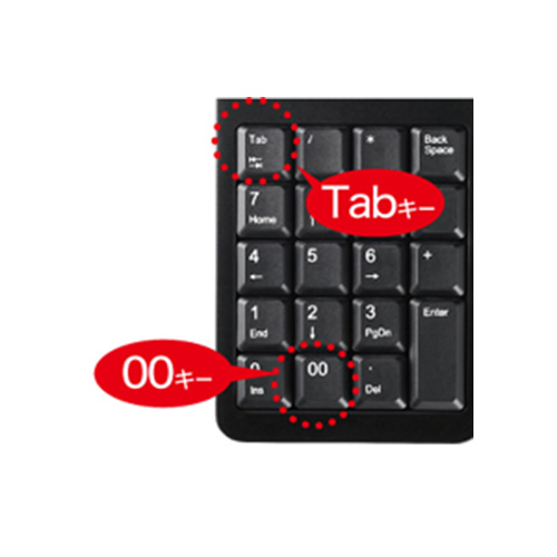 Excelのセル移動がラクラク出来る「Tabキー」を搭載。また、高額入力に便利な「00」キーを採用しており、表計算に最適です。本体裏面のラバーフットを幅広くして滑りにくくすることで、安定したタイピングを実現。通常のデスクトップキーボードと同じ19mmのキーピッチ。キーボードの使いやすさを、そのままテンキーボードでもご使用いただけます。 また本体上面を傾斜させ、より打ちやすいテンキーボードとなっています。