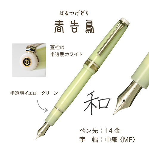 ●万年筆●ペン先:ステンレス、細字●蓋・胴・大先:PMMA樹脂●金属部品:ゴールドIP仕上げ●本体サイズ:?17×124mm(クリップ部含む)●本体重量:16.8g●色名:春告鳥(はるつげどり) ●最小出荷単位: 1