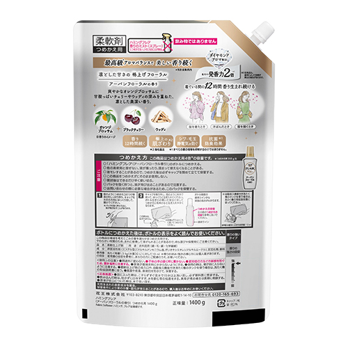 着用中発香力2倍(従来品比、素材によって効果が異なる場合があります)。最高級(当社柔軟剤内)アロマバランスで美しい香り続くダイヤモンドアロマ製法。新香調凛とした甘さの格上げフローラルのアーバンフローラルの香り。爽やかなオレンジブロッサムに甘酸っぱいチェリーやウッディの深みを重ねた、凛とした奥深い香り。香り12時間続く。極上の肌ざわり(当社品比)。シワ、毛玉、静電気を防ぐ。抗菌防臭効果(すべての菌の増殖を抑制するわけではありません)。