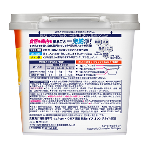 ●品目:食器用洗剤●用途:食器・調理用具用(食器洗い乾燥機専用)●仕様:粉末タイプ●種別:本体●容量:660g●香り:オレンジの香り●液性:弱アルカリ性●成分:界面活性剤(3%、ポリエーテルポリオール)、アルカリ剤(炭酸塩)、工程剤(硫酸塩)、漂白剤(炭酸塩)、水軟化剤(クエン酸塩)、表面改質剤、分散剤、漂白活性化剤、酵素 ●最小出荷単位: 3