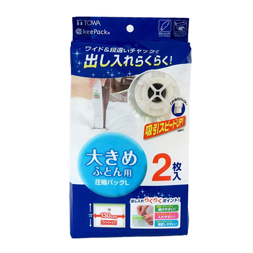 ●種別:大き目ふとん用(L)●外寸(縦×横):1300×1000mm●材質:本体=ポリエチレン・ナイロン、バルブ=ポリエチレン、スライダー=ポリエチレン●2枚入り ●収納の目安:シングル掛けふとん(ロング)なら1枚、シングル敷きふとんなら1枚、ダブル掛けふとん(6つ折り)なら1枚、ダブル敷きふとん(4つ折り)なら1枚 ●最小出荷単位: 36
