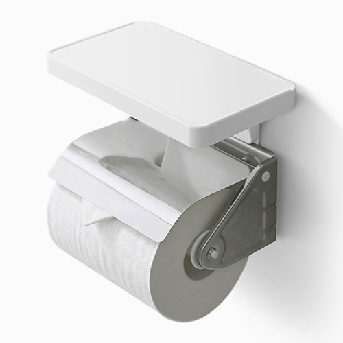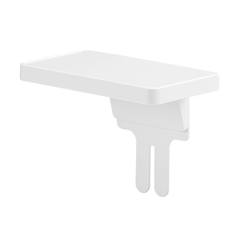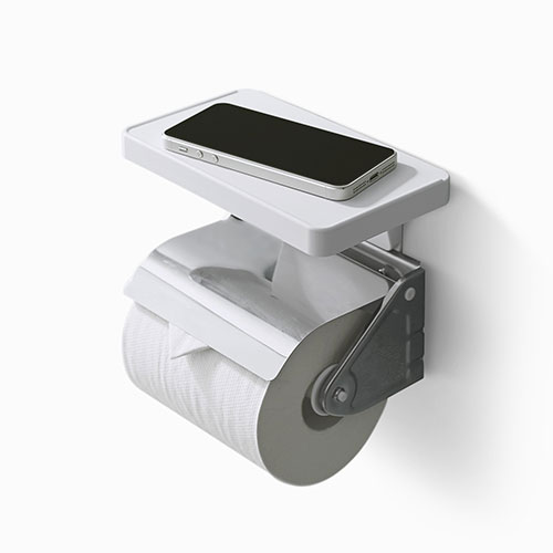 トイレットペーパーホルダの背面に差し込むだけで、ちょっとした小物を置くことの出来る棚です。耐荷重600g。