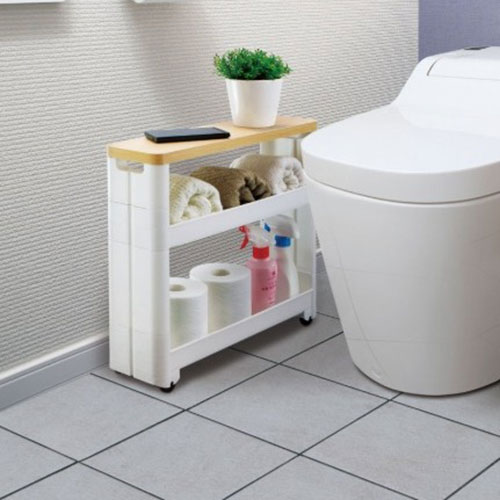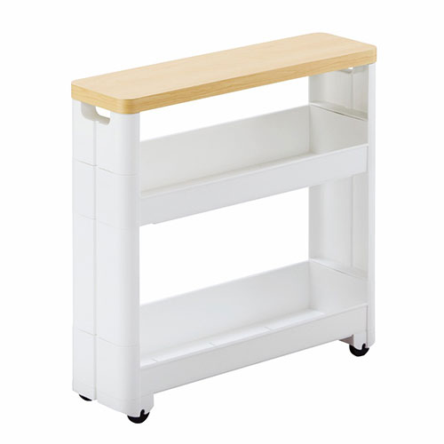 トイレットペーパーのストックやお掃除グッズの収納にピッタリなワゴンです。幅は12.5cm。奥行は55cmです。天板がフラットな木目調テーブルタイプなのでスマートフォンなどのちょい置きに便利です。
